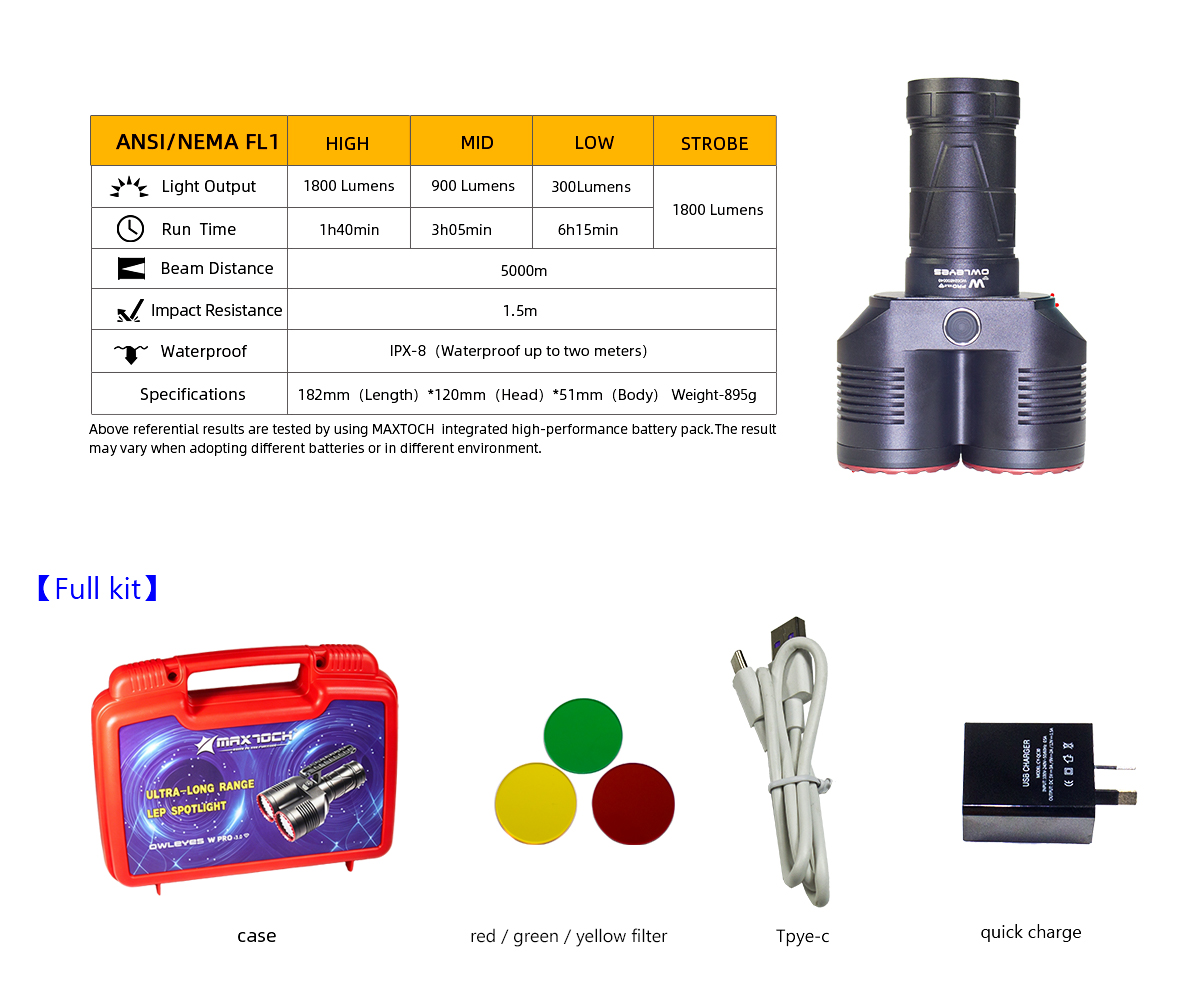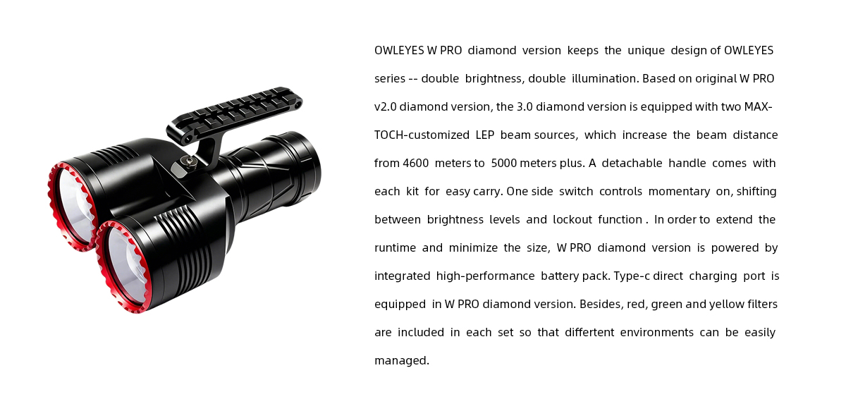 double brightness, double illumination. Based on original W PRO v3.0, diamond version is equipped with two MAXTOCH-customized LEP beam sources, which increase the beam distance from 4600 meters to 5000 meters plus. A detachable handle comes with each kit for easy carry. One side switch controls momentary on, shifting between brightness levels and lockout function. In order to extend the runtime and minimize the size, W PRO v3.0 diamond version is powered by integrated high-performance battery pack. Type-c direct charging port is equipped in W PRO diamond version. Besides, red, green and yellow filters are included in each set so that different environments can be easily managed.